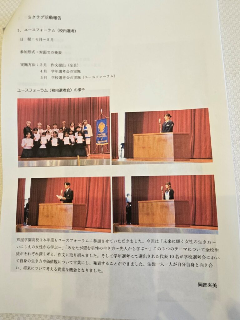 活動報告書が配付され、ユース・フォーラム(校内選考・リジョン)や甲寿園訪問、清掃ボランティアや